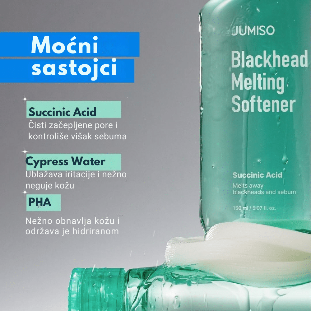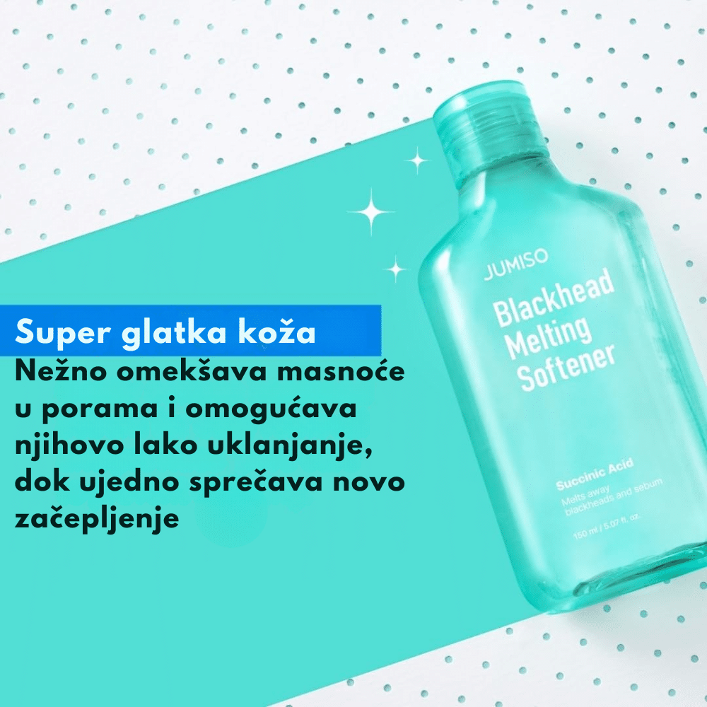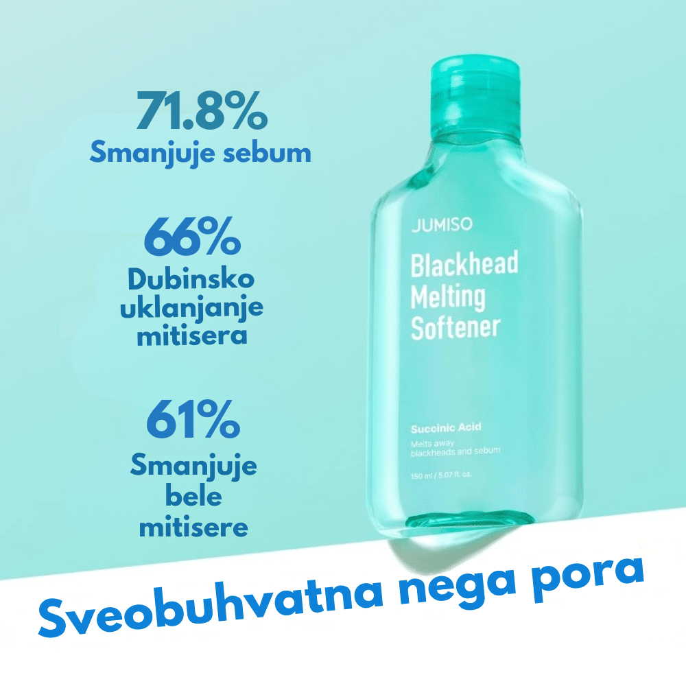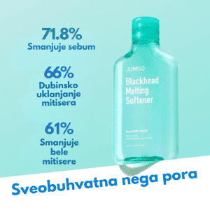 Jumiso Blackhead Melting Softner set je komplet za dubinsko čišćenje pora i uklanjanje mitisera, formulisan sa BHA i PHA kiselinama koje rastvaraju višak sebuma i nečistoće. Glavni proizvod – Blackhead Melting Softner – koristi ekstrakt kore vrbe, niacinamid i pantenol za nežno, ali efikasno otpuštanje zapušenih pora bez iritacije. U setu se nalaze 40 pamučnih blaznica i 10 pamučnih štapića za preciznu i higijensku aplikaciju. Redovnom upotrebom koža postaje čistija, glađa i uravnotežena, bez crnih tačkica i prekomernog sjaja.