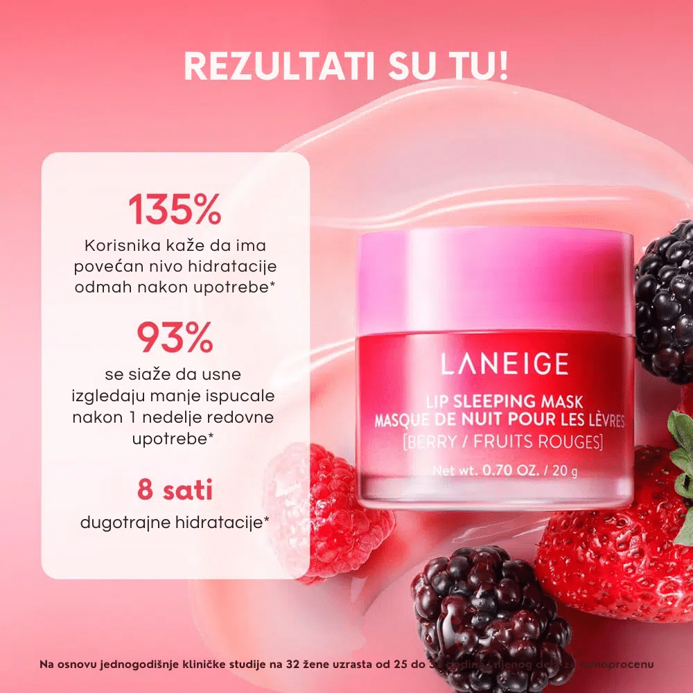 Laneige Lip Sleeping Mask Trio Set 3pcs je luksuzni set noćnih maski za usne koje intenzivno regenerišu, omekšavaju i obnavljaju suve usne tokom noći. Obogaćene Moisture Wrap™ tehnologijom, hijaluronskom kiselinom i antioksidansima iz voćnih ekstrakata, ove maske zaključavaju vlagu, uklanjaju suvoću i čine usne vidljivo mekšim, glatkijim i punijim već nakon prvog korišćenja. Trio set donosi tri omiljene varijante—Berry, Gummy Bear i Sweet Candy—savršene za svakodnevnu noćnu negu, poklon ili putovanja. • Lip Sleeping Mask EX Berry (20g)