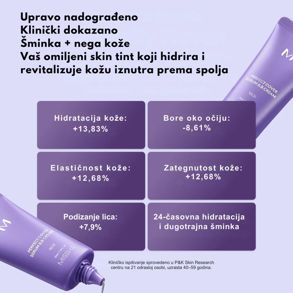 Missha Perfect Cover Serum B.B Cream #21 Light Beige je višenamenski BB krem sa serumskom formulom koji pruža srednje do jako pokrivanje, prirodan glow finiš i dugotrajnu hidrataciju. Obogaćen niacinamidom, hijaluronskom kiselinom i peptidima, ujednačava ten, prekriva crvenilo i diskoloracije, dok istovremeno neguje i obnavlja kožu. Lagana tekstura lako se stapa sa kožom, ne oksidira i pruža besprekoran, osvetljen i zdrav izgled tokom celog dana. Nijansa #21 Light Beige je svetla bež nijansa sa neutralno-žutim podtonom, idealna za svetle tonove kože koji žele prirodno ujednačen izgled bez sivila. Daje svež, čist i blago osvetljen finiš.