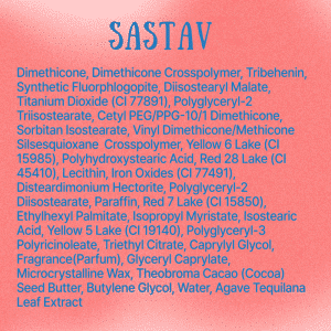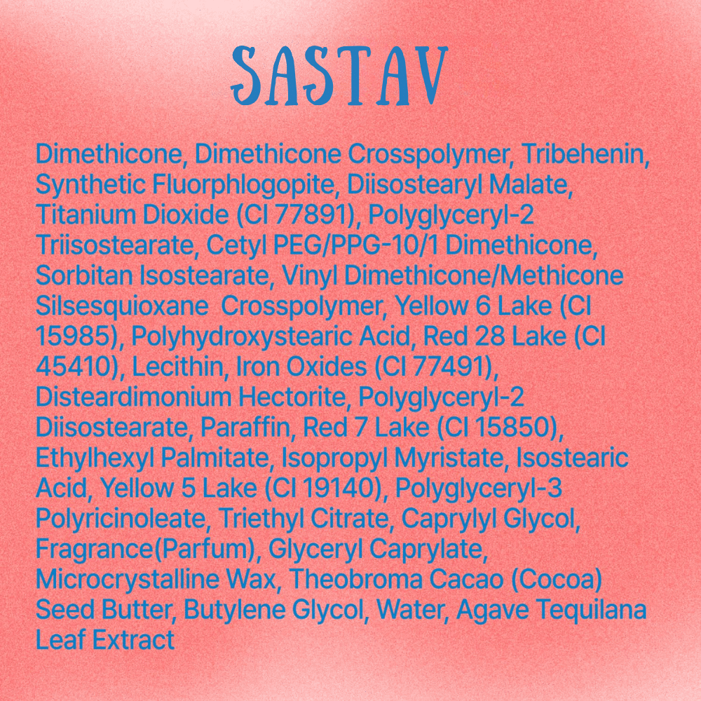 Dimethicone, Dimethicone Crosspolymer, Tribehenin, Polyglyceryl-2 Triisostearate, Diisostearyl Malate, Synthetic Fluorphlogopite, Titanium Dioxide (CI 77891), Phloxine B (CI 45410), Theobroma Cacao (Cocoa) Seed Butter, Agave Tequilana Leaf Extract, Cetyl PEG/PPG-10/1 Dimethicone, Sorbitan Isostearate, Vinyl Dimethicone/Methicone Silsesquioxane Crosspolymer, Polyhydroxystearic Acid, Polyglyceryl-2 Diisostearate, Disteardimonium Hectorite, Ethylhexyl Palmitate, Isopropyl Myristate, Isostearic Acid, Lecithin, Polyglyceryl-3 Polyricinoleate, Triethyl Citrate, Caprylyl Glycol, Glyceryl Caprylate, Butylene Glycol, Water, Fragrance, Iron Oxide Yellow (CI 77492), Lithol Rubine BCA (CI 15850), Lithol Rubine B, Iron Oxide Black (CI 77499), Brilliant Blue FCF (CI 42090).