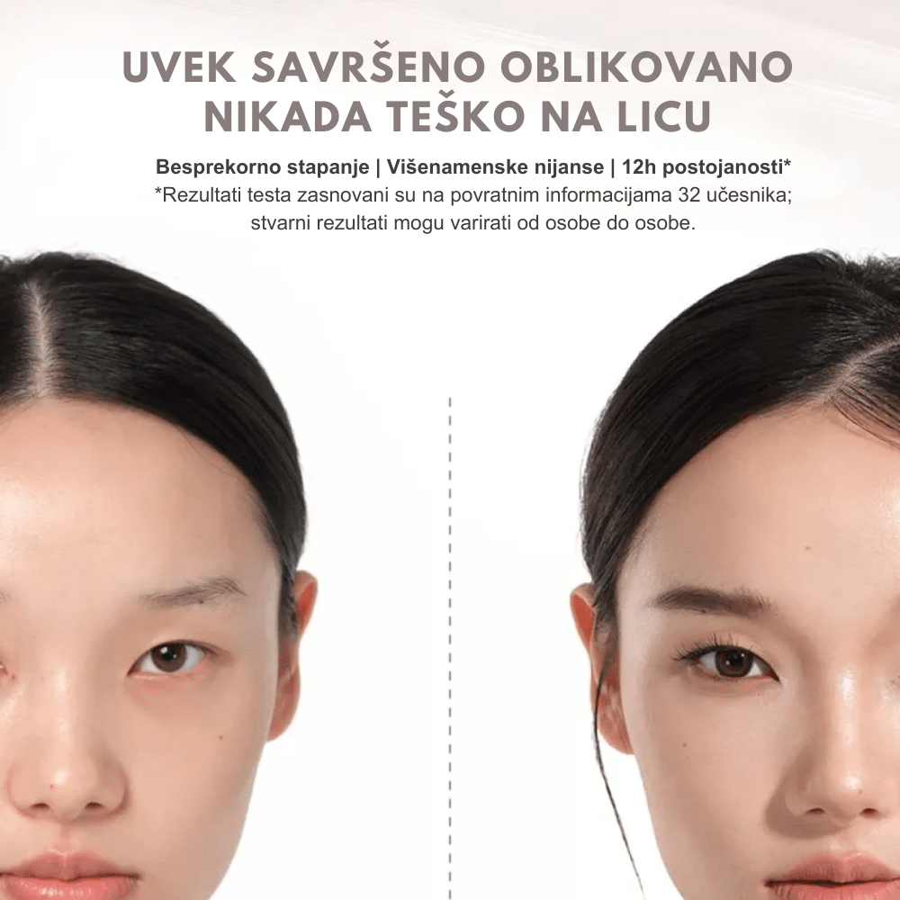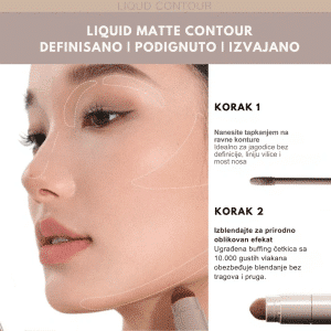 Nanesite malu količinu tečnog kontura aplikatorom ispod jagodica, duž ivice čela, nosa i linije vilice. Brzo razblendajte sunđerom ili četkicom pokretima nagore dok se formula potpuno ne stopi sa podlogom. Po potrebi dodajte još proizvoda za jaču definiciju. Može se koristiti preko tečnog ili pudera u kamenu, kao i direktno na koži.