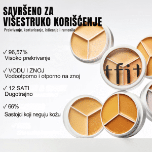 TFIT Cover Up Pro Concealer B01 Corrector je visoko-pigmentovan korektor za ciljanu korekciju boje koji koristi princip komplementarnih nijansi za neutralizovanje nepravilnosti i posvetljavanje tena. Oblikovan je kao tro-ton palette koja omogućava kombinovanje i prilagođavanje boje prema individualnim potrebama (poput podočnjaka, crvenila ili tamnih mrlja). Formula je lagana, dugotrajna (do 12 sati), vodootporna, a istovremeno sadrži negujuće sastojke kao što su hijaluronska kiselina, ceramid, panthenol i biljni ekstrakti koji pomažu u održavanju barijere kože. Nijansa B01 Corrector služi za korekciju boje – dizajnirana je da neutrališe nepravilnosti putem komplementarnih tonova (npr. žuto-zeleni podton za maskiranje crvenila, roze-ljubičasti za podočnjake) pre nego što se nanese odgovarajući ton za prekrivanje.