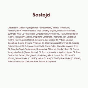 Polybutene, Hydrogenated Polyisobutene, Diisostearyl Malate, Bis-Diglyceryl Polyacyladipate-2, Caprylic/Capric Triglyceride, Synthetic Wax, Microcrystalline Wax, Silica Dimethyl Silylate, Phenoxyethanol, 1,2-Hexanediol, Ethylhexylglycerin, Fragrance, Iron Oxides (CI 77491/77492/77499), Titanium Dioxide (CI 77891).