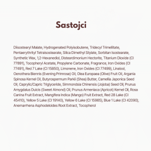 Polybutene, Hydrogenated Polyisobutene, Diisostearyl Malate, Bis-Diglyceryl Polyacyladipate-2, Caprylic/Capric Triglyceride, Synthetic Wax, Microcrystalline Wax, Silica Dimethyl Silylate, Phenoxyethanol, 1,2-Hexanediol, Ethylhexylglycerin, Fragrance, Iron Oxides (CI 77491/77492/77499), Titanium Dioxide (CI 77891).