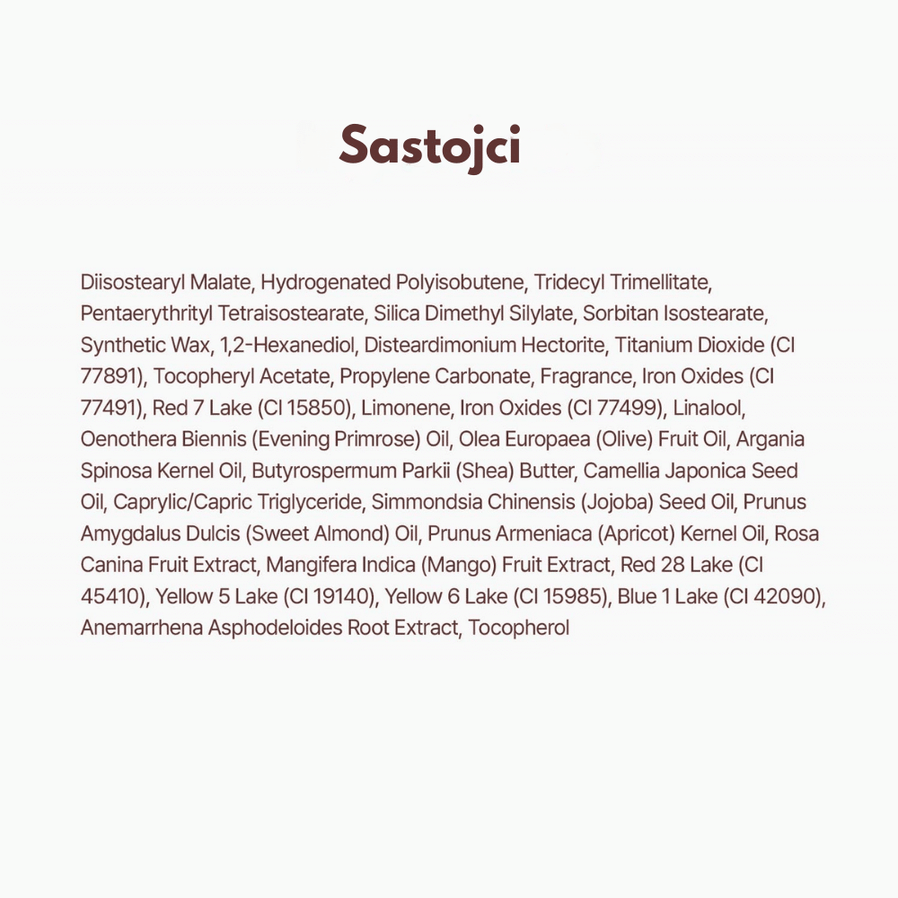 Polybutene, Hydrogenated Polyisobutene, Diisostearyl Malate, Bis-Diglyceryl Polyacyladipate-2, Caprylic/Capric Triglyceride, Synthetic Wax, Microcrystalline Wax, Silica Dimethyl Silylate, Phenoxyethanol, 1,2-Hexanediol, Ethylhexylglycerin, Fragrance, Iron Oxides (CI 77491/77492/77499), Titanium Dioxide (CI 77891).