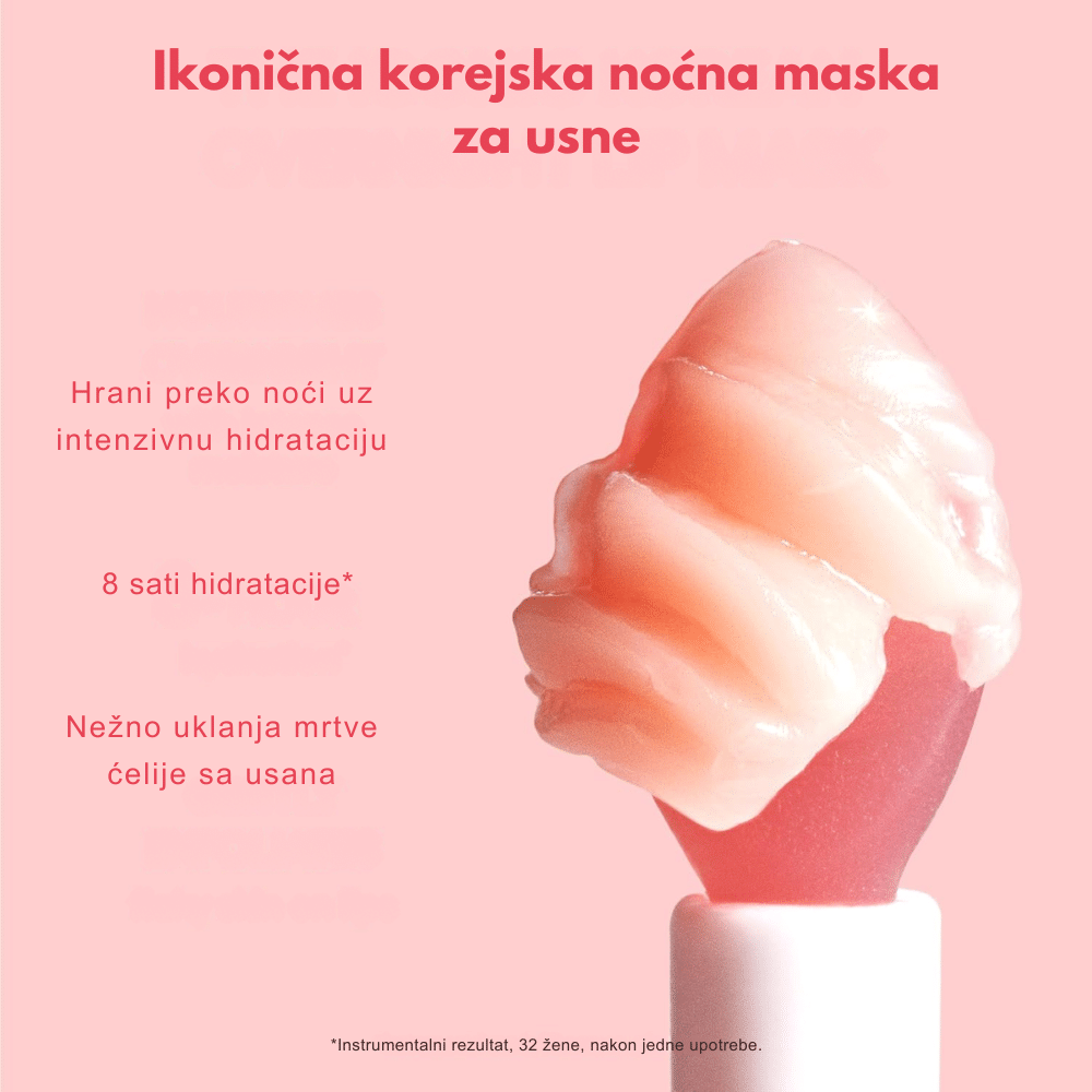 Uveče, na čiste i suve usne nanesite sloj maske – količina mora biti dovoljno debela da usne budu prekrivene. Ostavite tokom noći i ne uklanjajte. Ujutro uklonite višak ili nežno isperite, zatim nastavite sa rutinom nege usana ili nanesite balzam. Može se koristiti i danju kao intenzivnija nega kada su usne jako suve ili ispucale.