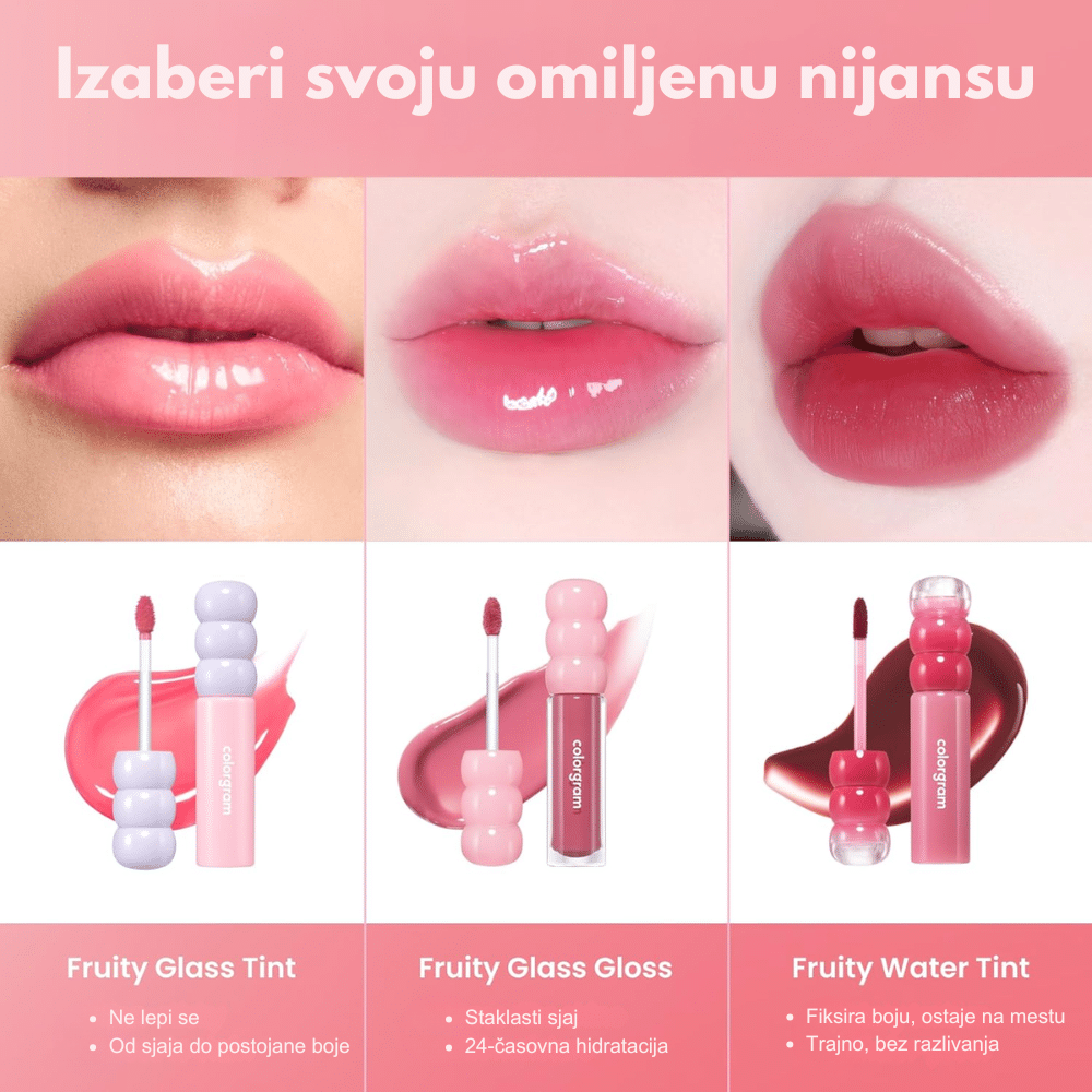 COLORGRAM Fruity Glass Tint Mini Duo Set #01 Double Gloss je savršen izbor za ljubitelje sjajnih i hidratantnih lip tintova. Ovaj set sadrži dve mini verzije popularnih nijansi: #00 Pearl Gloss, prozirni sjaj sa ružičastim šljokicama, i #1004 Pink Gloss, nežnu ružičastu nijansu sa hladnim podtonom. Kombinacija ovih nijansi pruža usnama svežinu, volumen i dugotrajan sjaj.