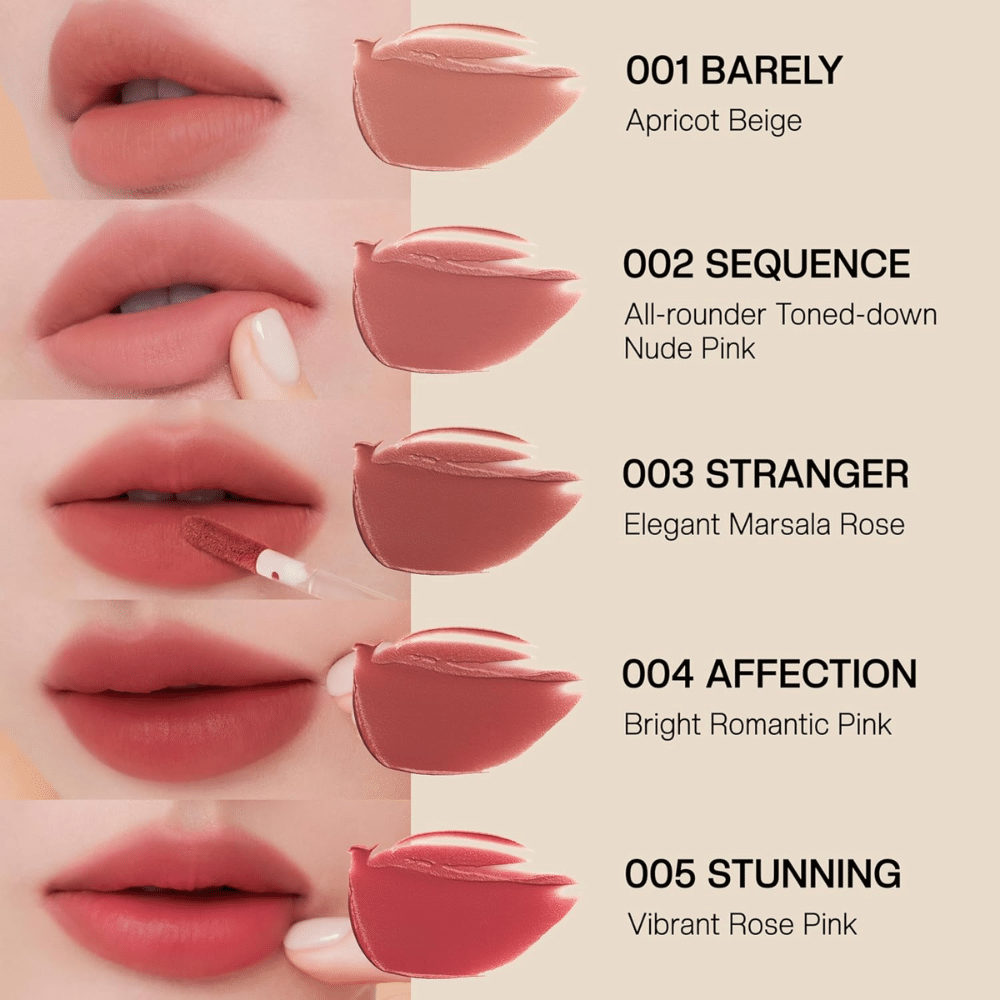 Muzigae Mansion Objet Liquid 001 Barely je tečni ruž-tint u nijansi mekog aprikot-bež tona koji pruža izuzetno mat završnicu sa elegantnim “blur” efektom, dizajniran da naglasi prirodnu lepotu usana uz dugotrajnu i udobnu primenu. Nijansa 001 Barely je mek, aprikot-bež ton koji suptilno osvetljava usne i stvara prirodan „moje usne, samo bolji“ efekat — savršena za svetliji i srednji ton kože koji želi nežan, ali profinjen izgled.