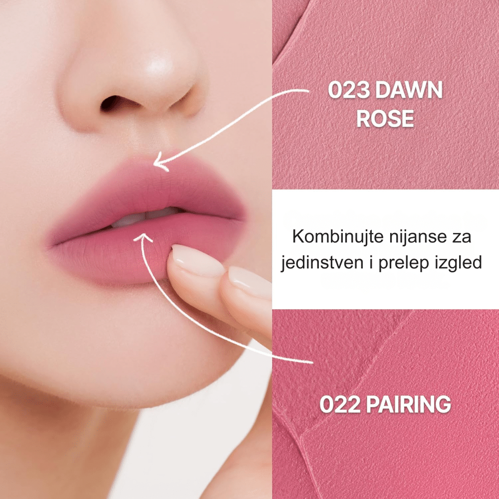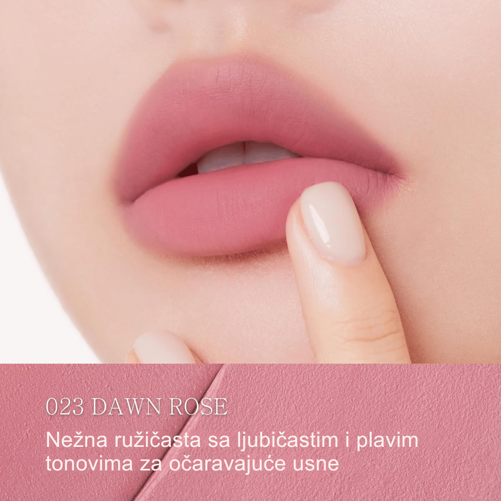 Muzigae Mansion Objet Liquid 023 Dawn Rose je romantični mat tečni ruž u nežnoj rosé-ružičastoj nijansi koji pruža laganu gel-mat teksturu, meki “blur” efekat i prirodno osvetljen izgled usana, idealan za svež, ženstven i svakodnevno nosiv make-up. Nijansa 023 Dawn Rose je mek, rosé-ružičasti ton koji osvežava ten i pruža suptilan, romantičan i prirodno blistav mat efekat — savršena za dnevne look-ove i ženstveni soft glam.