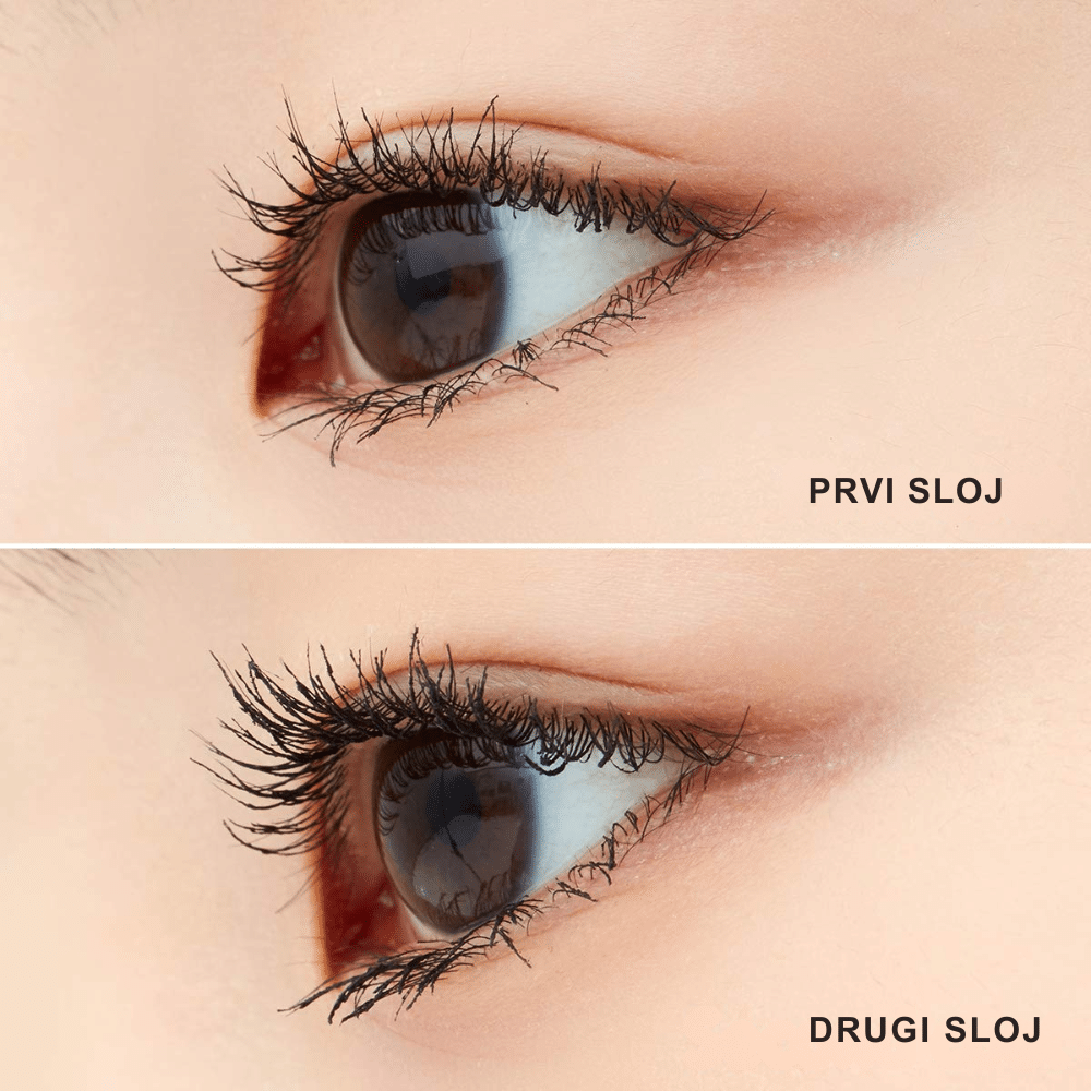 Početi nanošenje od korena trepavica uz blago pomeranje četkice levo-desno kako bi se dlačice ravnomerno obložile formulom. Zatim povući četkicu prema vrhovima za maksimalno produženje. Za intenzivniji efekat naneti drugi sloj pre nego što se prvi potpuno osuši.