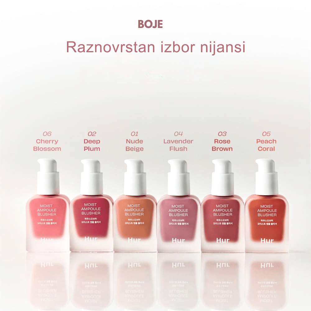 House of Hur Moist Ampoule Blusher #Peach Coral je tečno rumenilo sa ampulskom, hidratantnom formulom koje koži daje zdrav, osunčan i prirodno osvetljen izgled. Lagana serumasta tekstura se lako stapa sa kožom, ravnomerno se blenda i omogućava postepeno nadograđivanje bez fleka ili težine. Idealno je za svakodnevni makeup i postizanje svežeg „glow“ efekta sa dugotrajnom postojanošću. Nijansa #Peach Coral je topla peach-koralna boja sa svežim, osunčanim podtonom koja licu daje zdrav, blistav i mladalački izgled. Savršena je za tople i neutralne tonove kože i idealna za svakodnevne „no-makeup“ i letnje makeup look-ove.