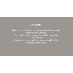 Nakon završetka rutine nege kože i nanošenja podloge, nanesite malu količinu rumenila na jagodice koristeći prste, četkicu ili sunđer. Lagano utapkajte i blendajte prema slepoočnicama za prirodan izgled. Za intenzivniji efekat, nanesite dodatni sloj. Proizvod se brzo suši, pa ga blendajte odmah nakon nanošenja