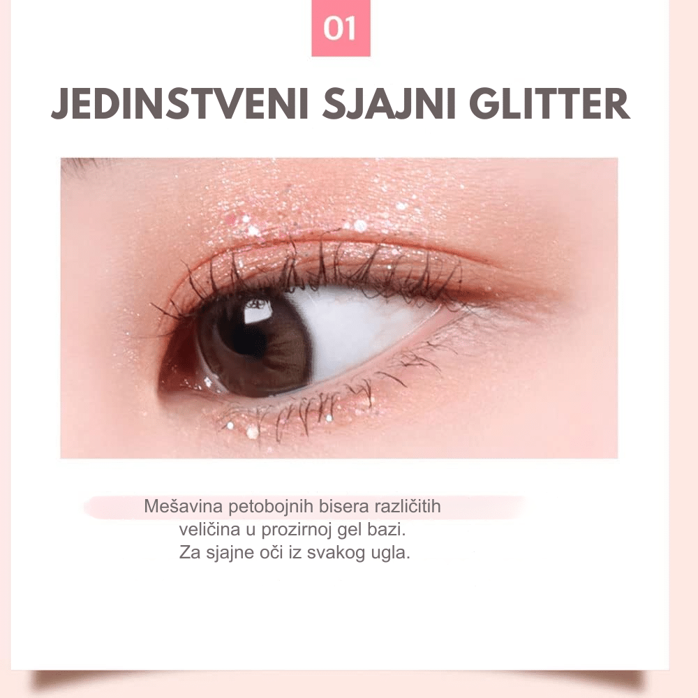 Nanesite tanki sloj direktno aplikatorom na kapak, zatim utapkajte prstom za ravnomeran sjaj. Može se nanositi samostalno, preko mat senki ili kao highlight u unutrašnjem uglu oka. Za jači efekat dodati drugi sloj nakon što se prvi osuši. Izbegavati intenzivno trljanje kako bi se očuvala postojanost glitera.