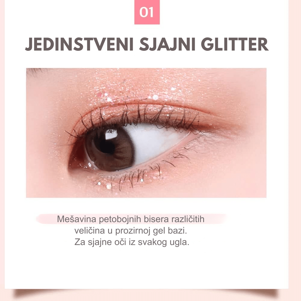 Nanesite tanki sloj direktno aplikatorom na kapak, zatim utapkajte prstom za ravnomeran sjaj. Može se nanositi samostalno, preko mat senki ili kao highlight u unutrašnjem uglu oka. Za jači efekat dodati drugi sloj nakon što se prvi osuši. Izbegavati intenzivno trljanje kako bi se očuvala postojanost glitera.
