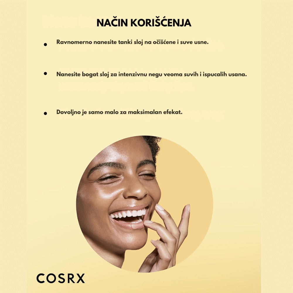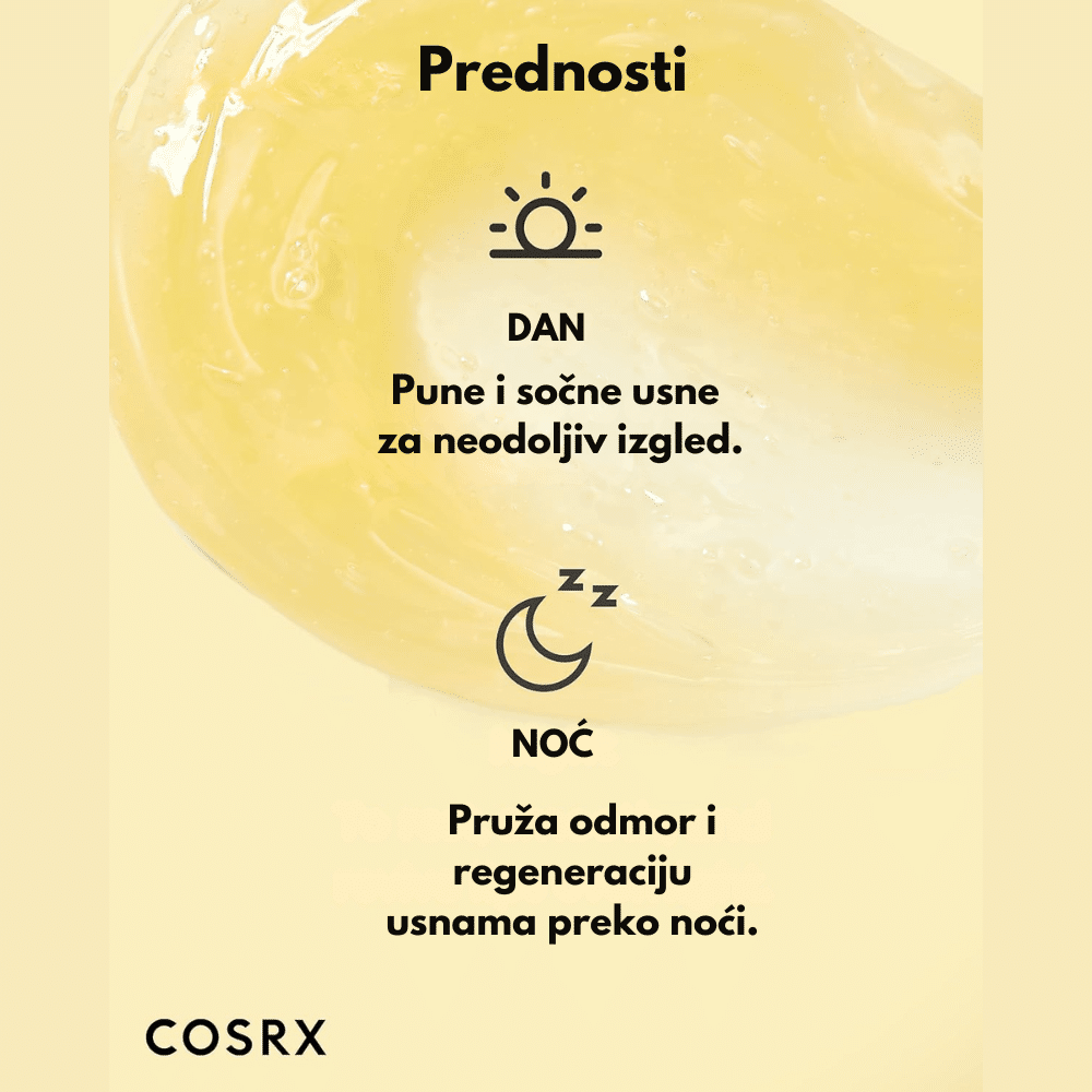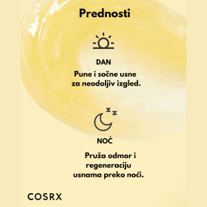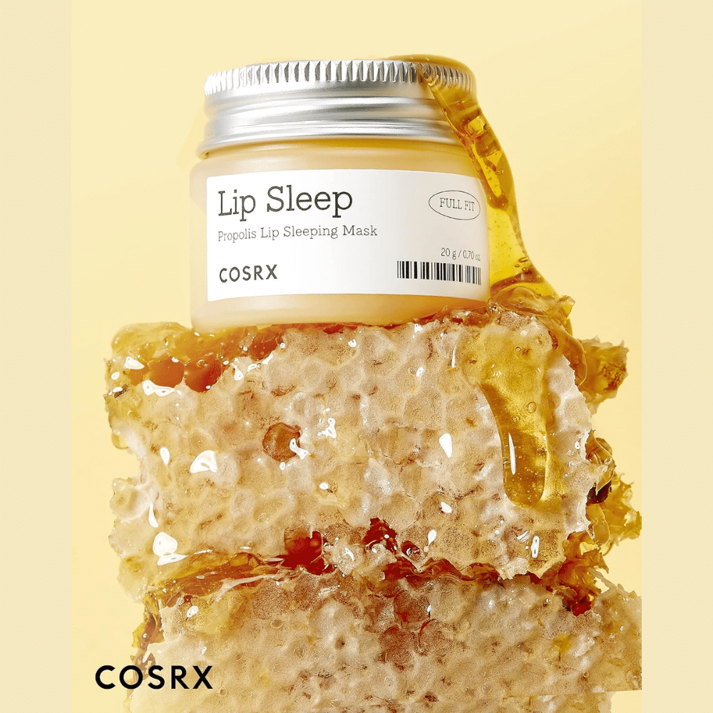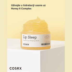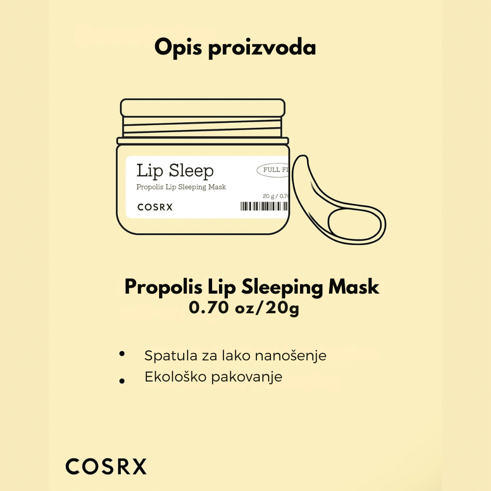 COSRX Full Fit Propolis Lip Sleeping Mask nudi luksuznu negu usana — bogata formula sa Propolisom i kompleksom šest sastojaka dobijenih iz meda formira barijeru koja intenzivno hidrira i omekšava usne tokom noći, ostavljajući ih punijim i glatkijim.
