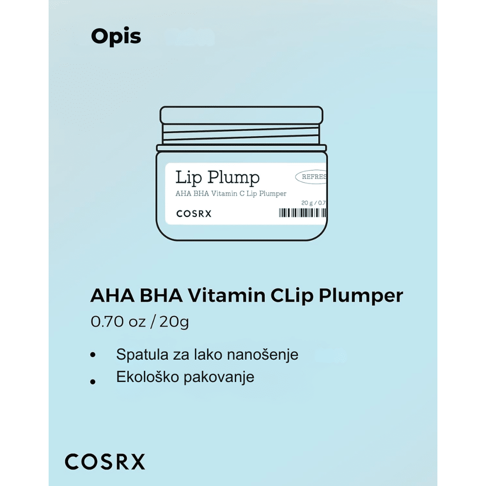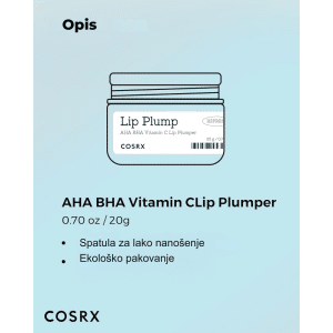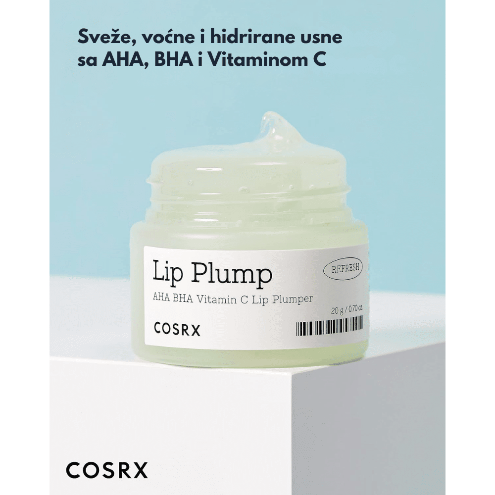 COSRX Refresh AHA BHA Vitamin C Lip Plumper je intenzivna balzam-krema za usne koja kombinuje eksfolijaciju i negu: AHA i BHA uklanjaju mrtve ćelije sa usana, dok derivati vitamina C i volumizirajući sastojci „pumpaju” usne i vraćaju im vitalnost. Textura je gel-krema koja se topi na usnama, ostavljajući ih glatkim, mekšim i vizuelno punijim. Idealna za one koji žele negovane, punije usne bez invazivnih tretmana. Proizvod dolazi u formi transparentne/ne-bojene formule koja obezbeđuje efekt volumizovanih i negovanih usana, bez dodavanja intenzivne boje. Pogodan je za sve tonove kože, posebno za svetao do srednji ten — odličan kao baza ili završni sloj za usne koje traže volumen i negu.