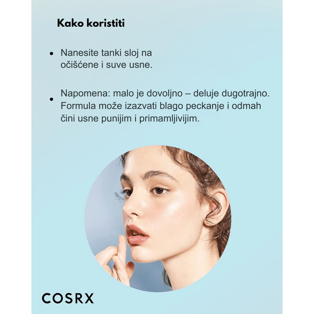 Na čiste i suve usne naneti umeren sloj proizvoda pomoću prsta ili aplikatora. Može se koristiti samostalno kao intenzivna nega noću ili tokom dana. U zavisnosti od stanja usana možete osetiti nežno peckanje — to je rezultat volumizujućeg efekta. Izbegavati kontakt sa otvorenim ranama ili jako ispucalim delovima kože.