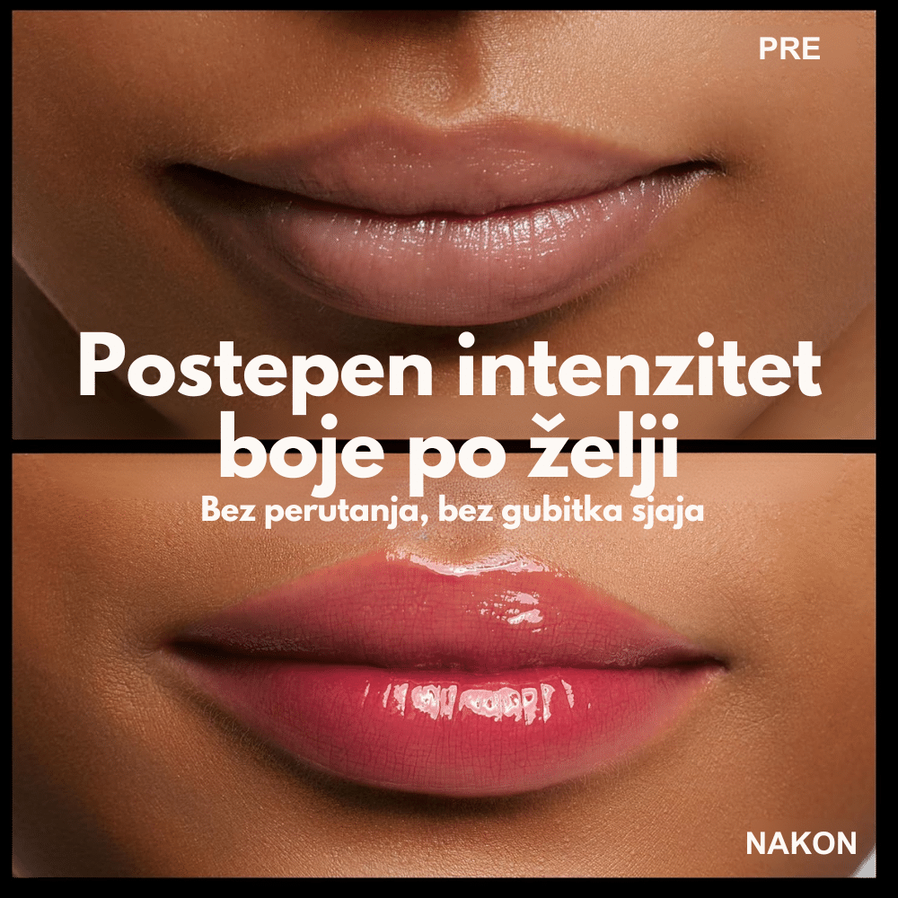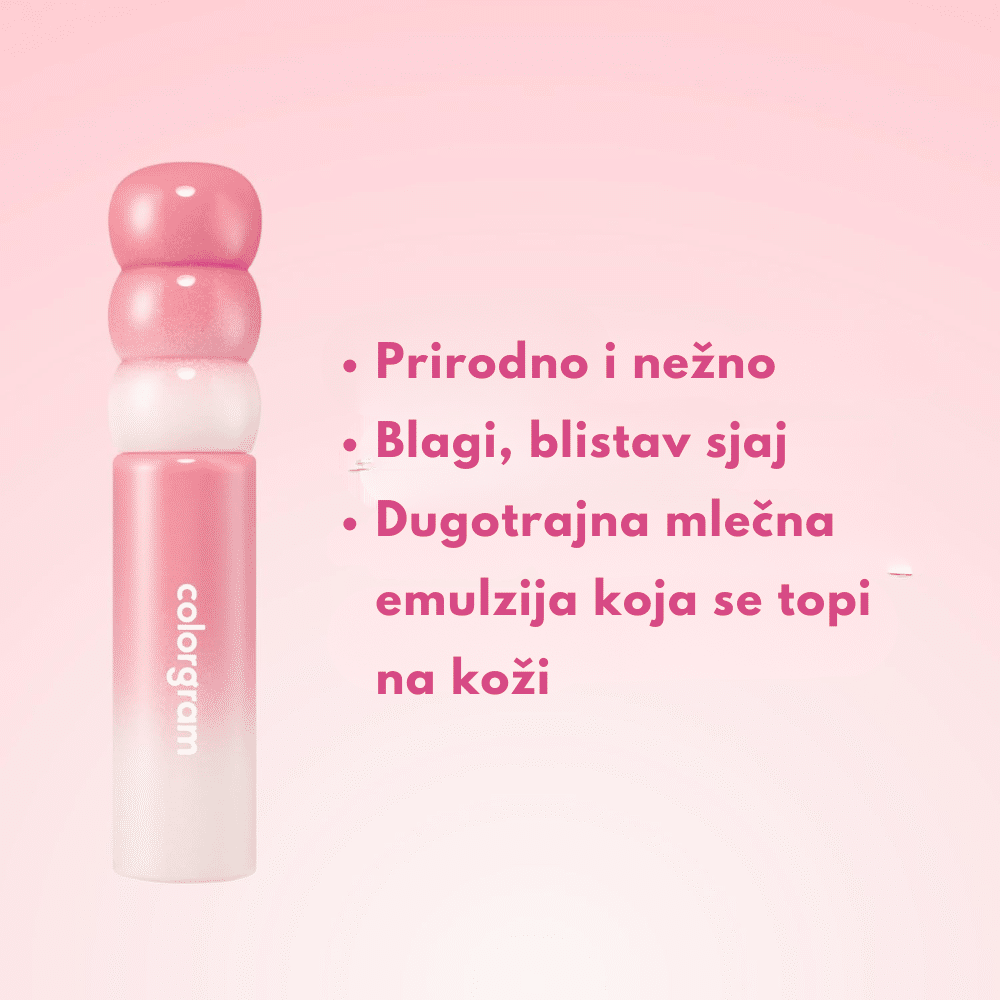 Lagani lip tint sa mlečno-breskvastom nijansom i staklastim sjajem koji daje usnama svež, prirodan izgled.