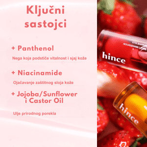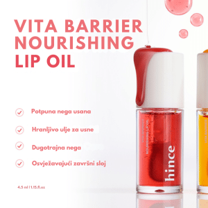 Hince Vita Barrier Nourishing Lip Oil 01 Kingsberry je hranljiva lip oil formula koja kombinuje vitamin C polipeptid, niacinamid i pantenol sa uljima ricinusa, suncokreta i jojobe, pružajući usnama intenzivnu hidrataciju, zaštitniu barijeru i sjajan, ne-ljepljiv završetak. Idealna za suve, ispucale usne koje trebaju negu i blistav izgled. Nijansa 01 Kingsberry pogodna je za sve tonove kože: radi se o prozirnoj crvenkastoj boji koja blago nijansira usne sa sjajem i daje im zdrav, negovan izgled bez intenzivne boje.